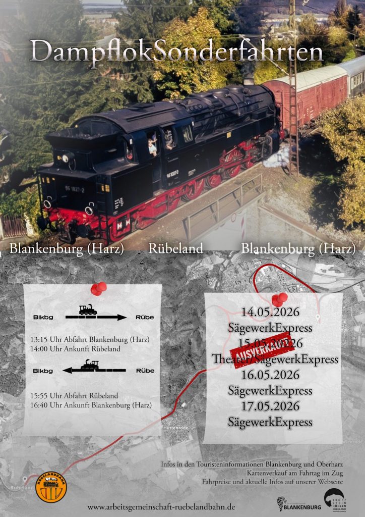 Das klingt nach einer wunderbaren Veranstaltung! Am 14. Mai 2026 wird die Rübelandbahn zum Herrentag fahren und eine schöne Reise von Blankenburg (Harz) nach Rübeland anbieten. Die Fahrt beginnt um 13:15 Uhr und bringt die Passagiere um 14:00 Uhr nach Rübeland. Dort haben die Gäste bis 15:55 Uhr Zeit, die beeindruckenden Rübeländer Tropfsteinhöhlen zu besuchen oder in einer der gemütlichen Gaststätten bei Kaffee und Kuchen zu entspannen.
