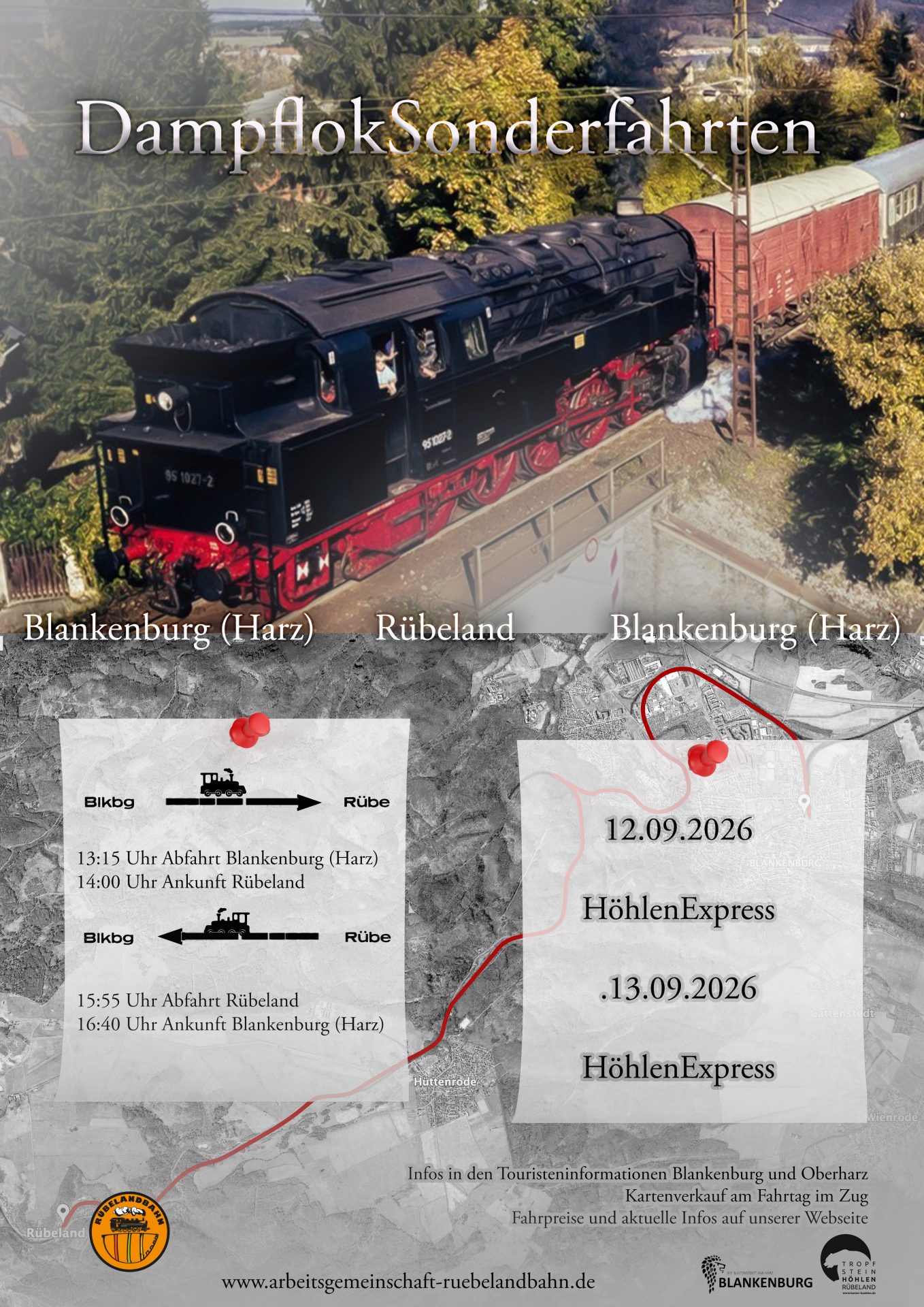 Fahrkartenverkauf ab 12:00 Uhr im Bahnhof Blankenburg (Harz) Abfahrt Blankenburg (Harz)   13:15 Uhr Ankunft Rübeland 13:55 Uhr Abfahrt Rübeland 15:55 Uhr Ankunft Blankenburg ( Harz ) 16:40 Uhr AdvendsExpress Am Sonntag, den 07.12.2025 ist es wieder soweit, Dampfzugromantik mit der „Bergkönigin“, der Historischen Dampflok 95 027, schnaufend auf einer der beeindruckendsten Steilstrecken durch die wunderschöne […]