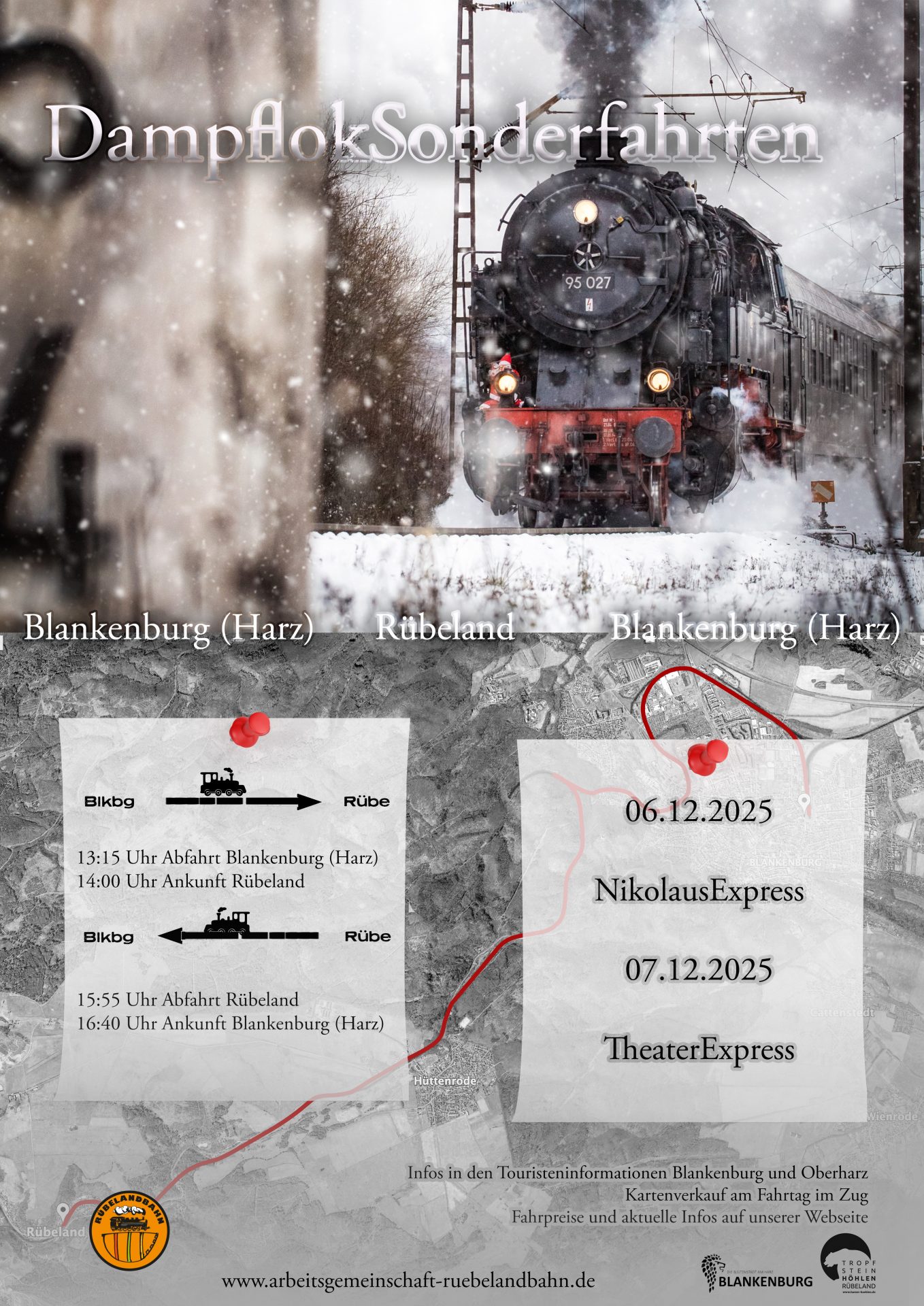 Am Samstag, den 06.12.2025 ist es wieder soweit, Dampfzugromantik mit der „Bergkönigin“, der Historischen Dampflok 95 027, schnaufend auf einer der beeindruckendsten Steilstrecken durch die wunderschöne und sehenswerte Harzlandschaft. Erleben sie eine Fahrt nach Rübeland der besonderen Art. Die „Bergkönigin“ zieht den NikolausExpress. Der Nikolaus erwartet seine Kleinen Fahrgäste mit einer süßen Überraschung!